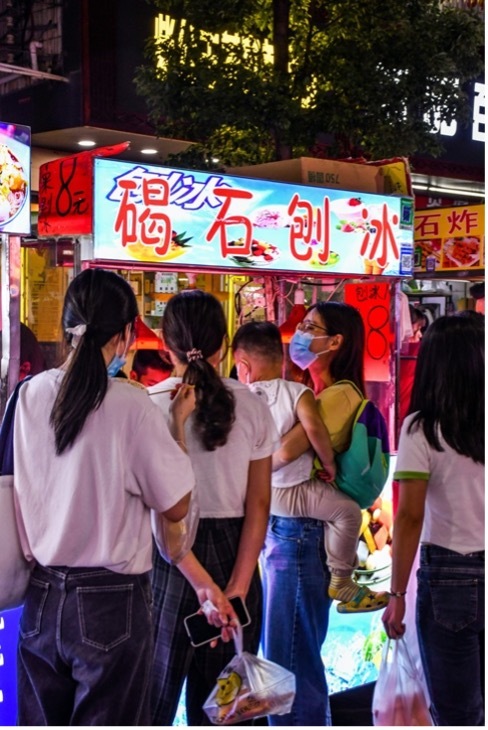 白天它是一条双向道的马路,下午四点后才开始变身,陆陆续续有人推着小摊,开始准备做生意。随着夜幕降临,盐田街便会由“双向马路”变为拥挤的小摊集市,一点点热闹起来。