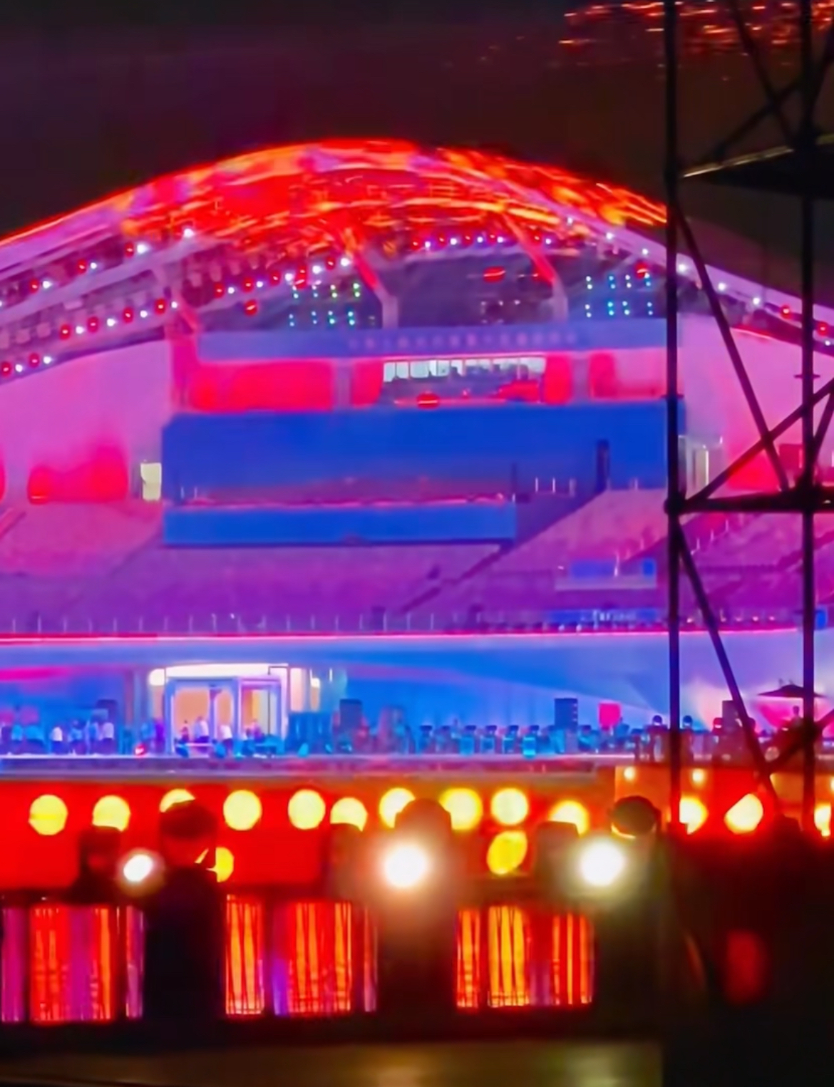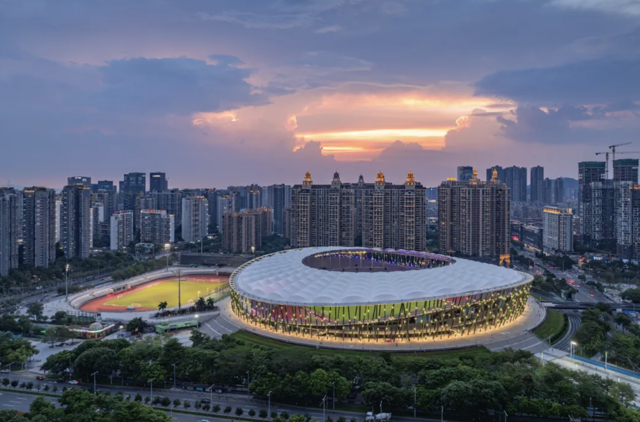 剧场最惊艳的创新在于陆域看台与水域舞台的双结构设计,其中水域舞台面积达3790平方米,连同周边水域总面积约8000平方米,堪称全国最大的户外水上舞台。陆域看台以“花瓣”形态散落场边,面向水域形成自然围合,完美呼应“同心共享”的赛事理念。