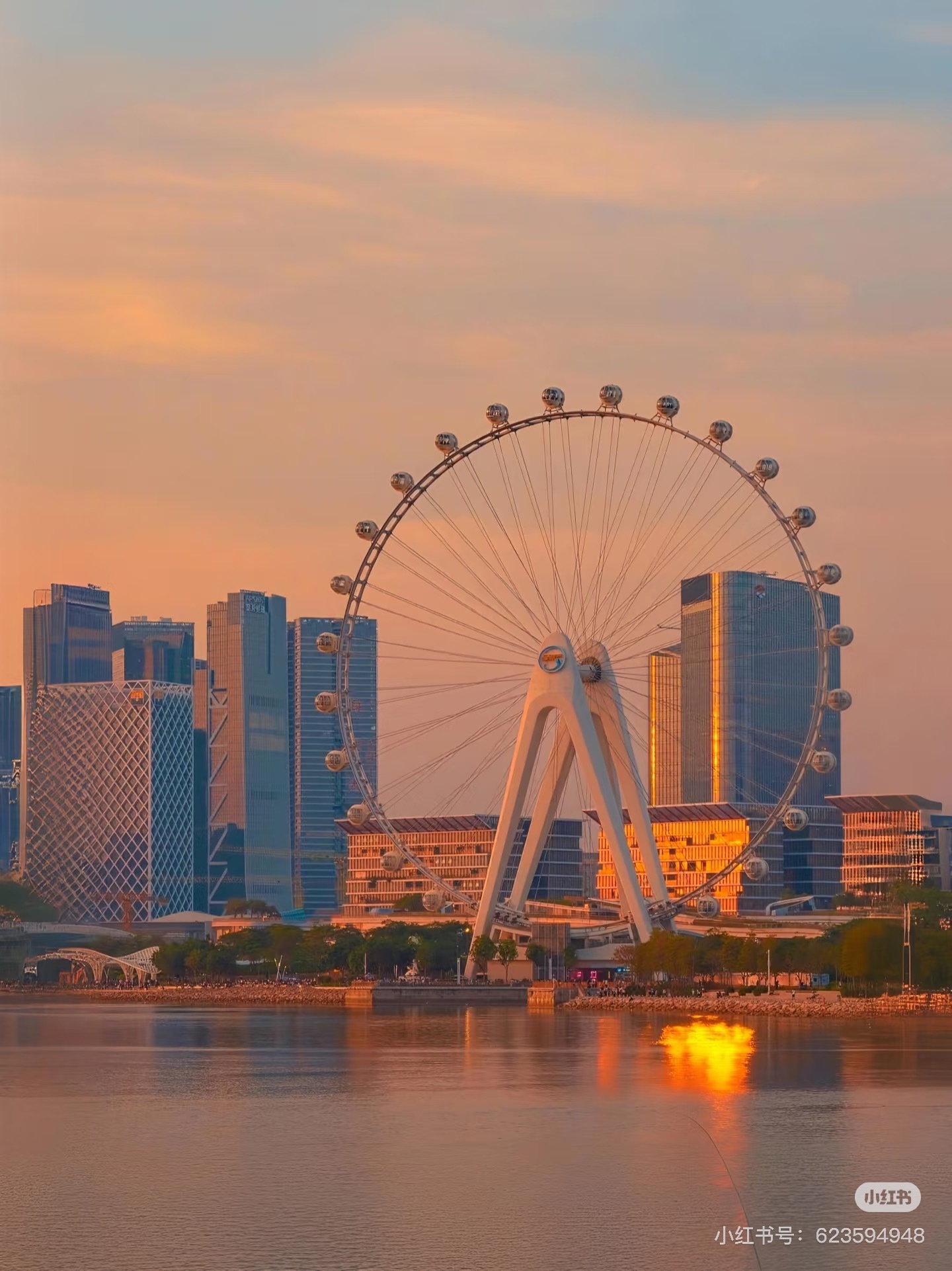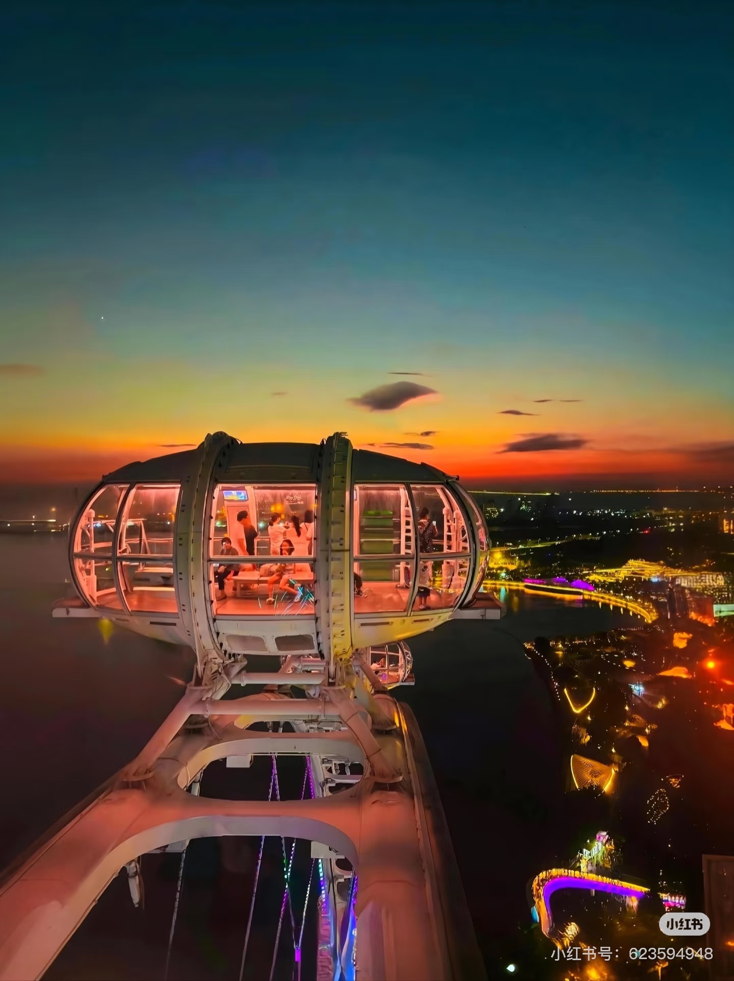 乘坐“湾区之光”摩天轮,这是亚洲排名第一、世界第三的摩天轮,总高128米,设有28个进口轿厢,每个轿厢净面积16.8㎡,可容纳25人,是国内首个回转式大轿厢摩天轮。