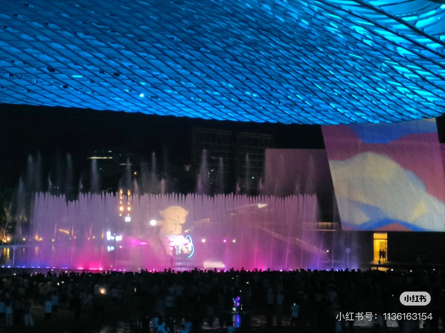 作为深圳夜景的“顶流打卡地”,欢乐港湾的《鲲鹏之梦》水秀堪称露天艺术标杆。以“鲲鹏”为核心意象,巨幕投影将深海、星海等九幕主题娓娓道来,多曲线喷泉时而如银龙腾空,时而如花瓣绽放,搭配震撼声乐打造沉浸式体验。